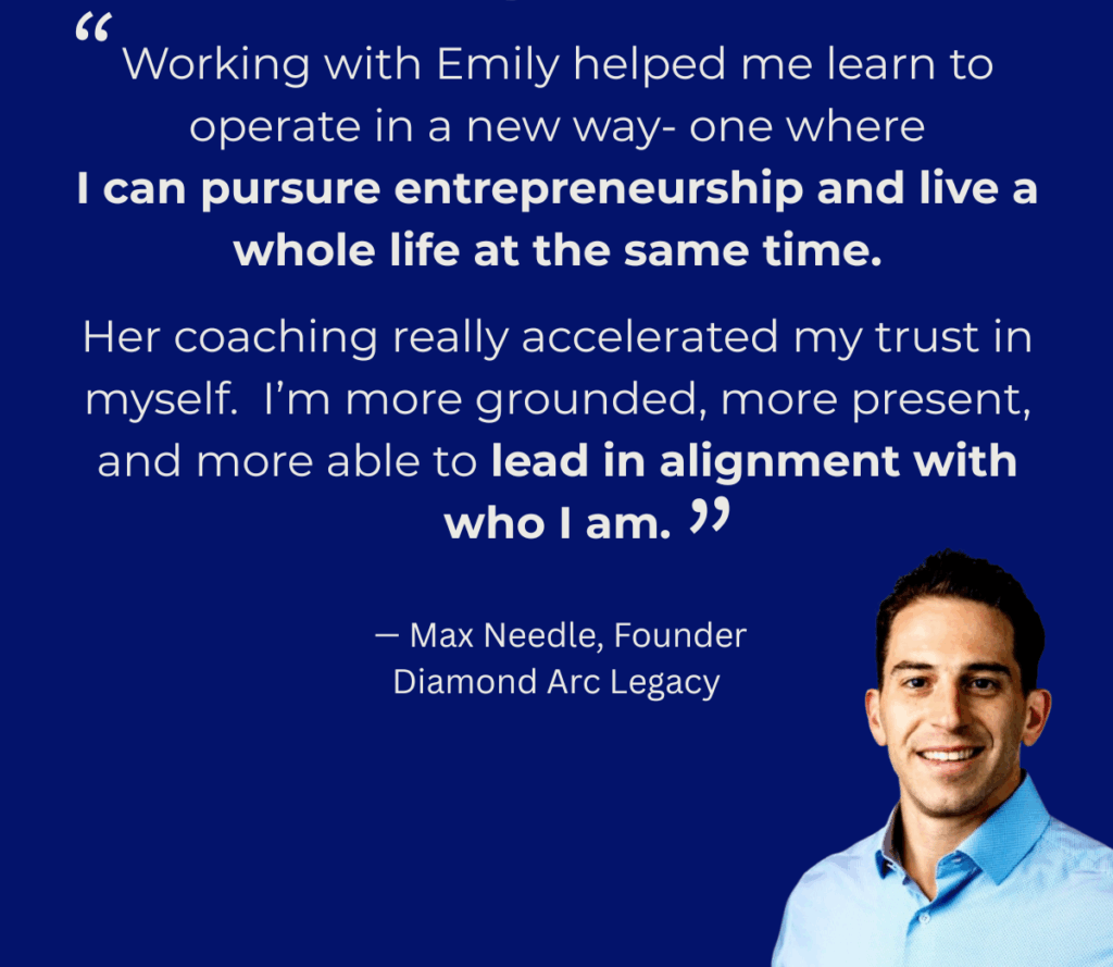 “The combination of Emily’s entrepreneurial and P.E. operating experience is such an asset. It means you get a coach… but also a thought partner who has actually been there and understands the stakes of your work” – Max Needle, Founder, Diamond Arc Legacy